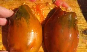 Плоды отличаются высокой плотностью и мясистостью. При разрезе видно, что мякоть очень сочная, но при этом не водянистая. Количество семенных камер небольшое, семян мало, что повышает долю полезной мякоти в общем объеме плода.