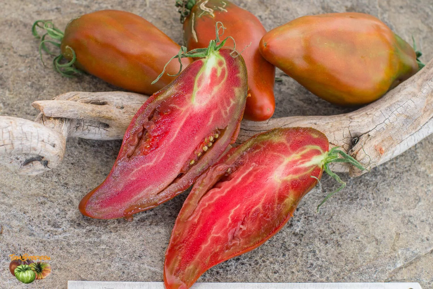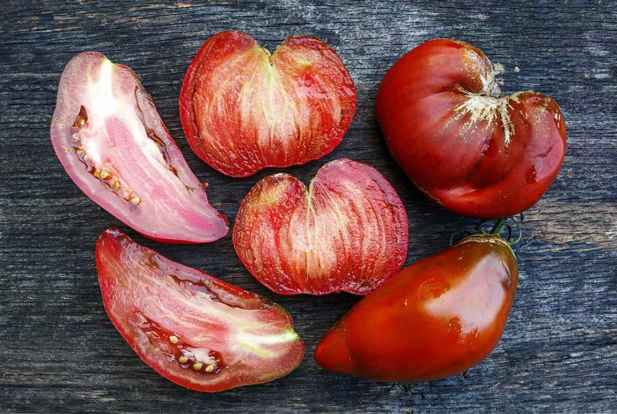 Темно-бордовая окраска в состоянии полной биологической зрелости говорит о высоком содержании антоцианов и ликопина. Такие плоды отлично подходят не только для нарезки, но и для переработки на густые соусы, пасты и соки, которые получаются насыщенного цвета и вкуса.