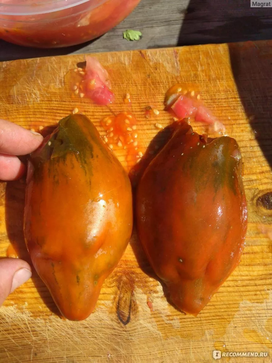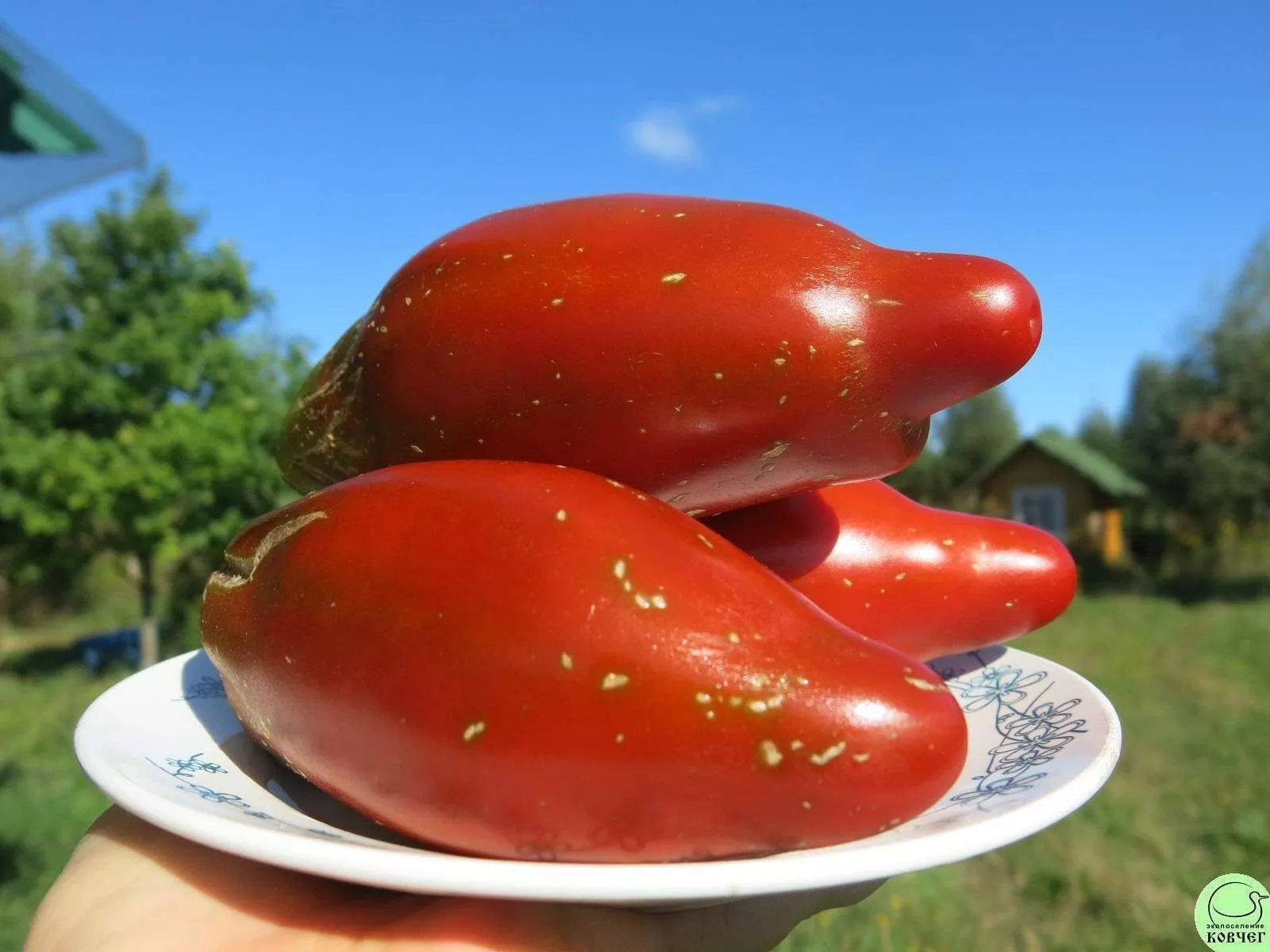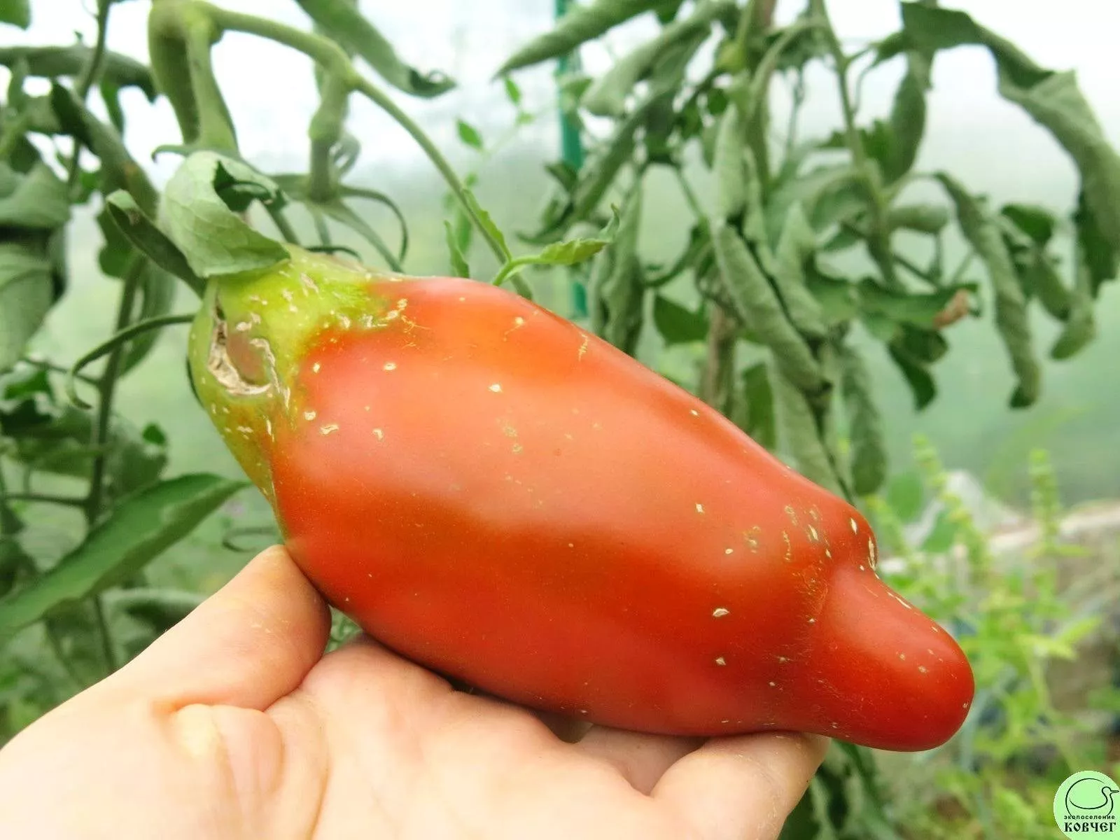 Главная отличительная черта сорта – уникальная форма плодов. Они не просто удлиненные, а имеют ярко выраженную перцевидную форму: часто сужаются к кончику, образуя характерный «носик». У основания, в области плодоножки, может наблюдаться слабая ребристость. Средняя масса одного томата составляет 200-300 граммов, что для перцевидной формы является весьма солидным показателем.