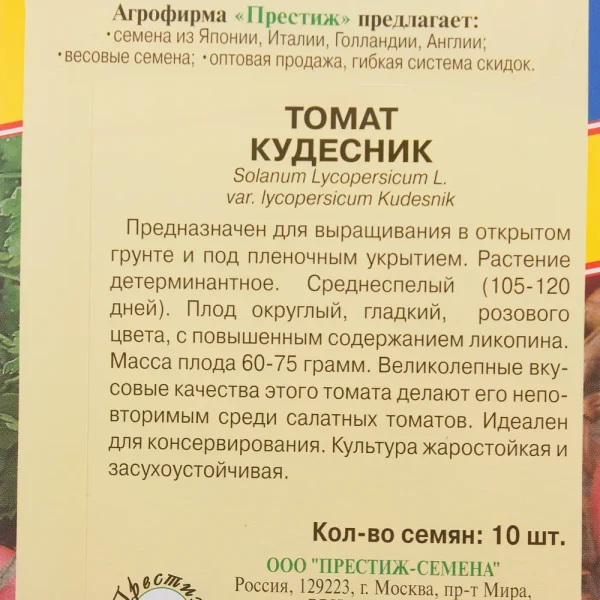 Основные технические характеристики сорта собраны в таблице ниже. Эти данные — официальный паспорт томата Кудесник, на который стоит опираться при планировании посадок.