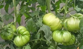 Листовая пластина стандартная для томата, без выраженных особенностей. Особого внимания заслуживает характер плодоношения. Плодовые кисти формируются с промежутком в 2-3 листа, но завязываемость в каждой из них невысокая. Это компенсируется выдающимся размером каждого томата. Для получения крупных плодов и предотвращения загущения растение рекомендуется вести в 1 или 2 стебля, своевременно удаляя все пасынки (боковые побеги).