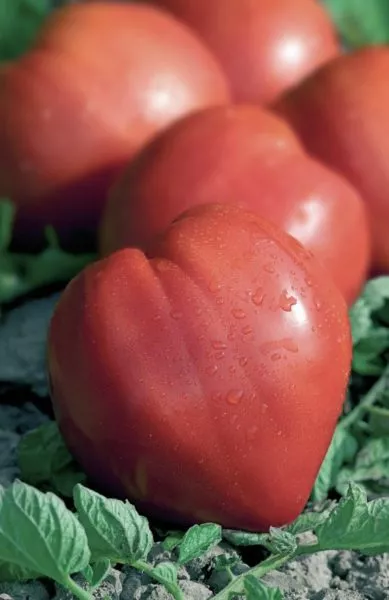 Внешний вид растения типичен для индетерминантных томатов: мощный, сильнорослый куст с длинными междоузлиями и крупными, темно-зелеными листьями. Однако его уникальность полностью раскрывается в плодах. Помидоры этого сорта имеют идеальную сердцевидную форму, часто с небольшой ребристостью у плодоножки. В стадии полной зрелости они приобретают глубокий, теплый малиново-розовый оттенок.