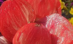 При полном созревании кожица и мякоть приобретают нежный, матово-розовый цвет без примеси оранжевых или ярко-малиновых тонов. Плоды многокамерные, с небольшим количеством семян. Мякоть очень сочная, нежная, с высоким содержанием сухих веществ, что в агрономии часто характеризуется как «тающая» или маслянистая консистенция. Именно эта особенность строения мякоти напрямую влияет на насыщенный вкус с гармоничным балансом сладости и легкой кислинки.