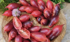 Главная отличительная черта этого сорта — его плоды, которые выглядят очень декоративно. Их форма классифицируется как сливовидная, или пальчиковая, но с обязательным острым «носиком» на кончике, что является сортовым признаком. Средняя масса каждого томата составляет около 20-25 граммов, что делает плоды идеально подходящими для цельноплодного консервирования и украшения блюд.