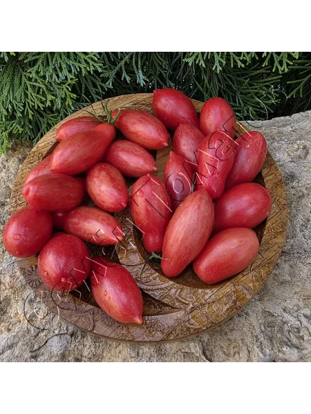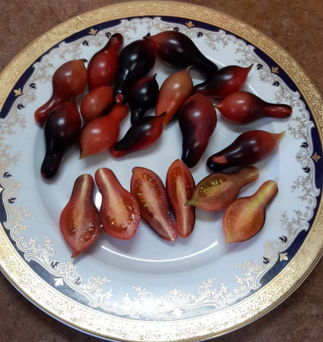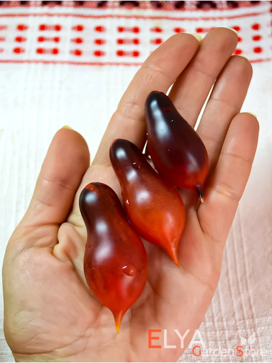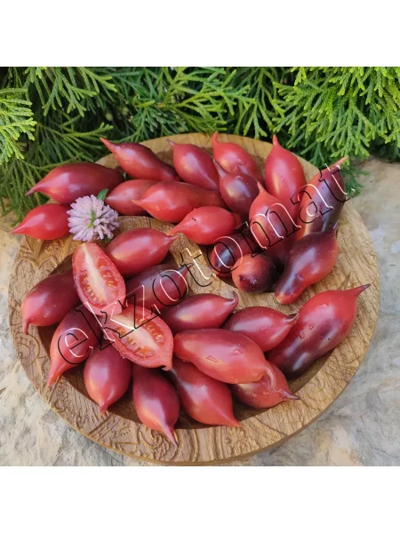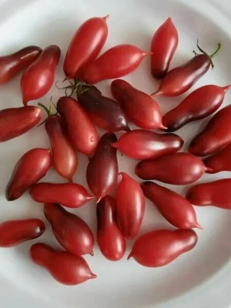 Главная отличительная черта этого сорта — его плоды, которые выглядят очень декоративно. Их форма классифицируется как сливовидная, или пальчиковая, но с обязательным острым «носиком» на кончике, что является сортовым признаком. Средняя масса каждого томата составляет около 20-25 граммов, что делает плоды идеально подходящими для цельноплодного консервирования и украшения блюд.
