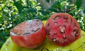Мякоть у зрелых помидоров очень плотная, сахаристая на изломе и отличается высокой мясистостью. Плоды многокамерные, но семенных камер немного, а сами семена мелкие и их количество невелико, что является большим преимуществом для свежего потребления и переработки в соки или соусы.