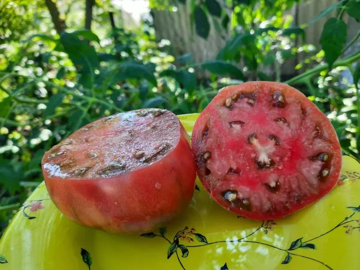Мякоть у зрелых помидоров очень плотная, сахаристая на изломе и отличается высокой мясистостью. Плоды многокамерные, но семенных камер немного, а сами семена мелкие и их количество невелико, что является большим преимуществом для свежего потребления и переработки в соки или соусы.