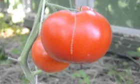 Форма плодов — типично плоскоокруглая, с заметной ребристостью у плодоножки, которая становится более выраженной у самых крупных томатов. В состоянии полной биологической зрелости они приобретают равномерный насыщенно-красный цвет без зеленого пятна у плодоножки.