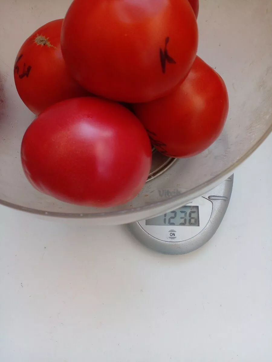 Форма плодов — типично плоскоокруглая, с заметной ребристостью у плодоножки, которая становится более выраженной у самых крупных томатов. В состоянии полной биологической зрелости они приобретают равномерный насыщенно-красный цвет без зеленого пятна у плодоножки.