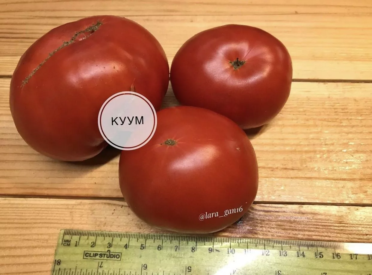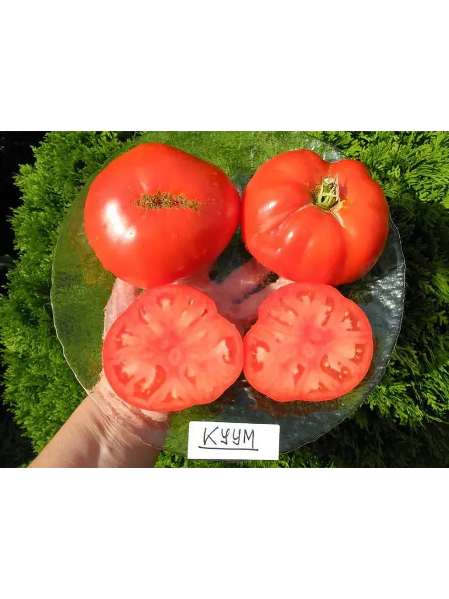 Мякоть очень плотная, мясистая и при этом сочная. На разломе явно видна ее сахаристая, зернистая структура. Плоды многокамерные, но семенных камер немного, и они заполнены мякотью с небольшим количеством семян. Такое строение делает томаты Куум идеальными для свежих салатов и переработки на густые соусы или соки.