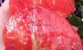 Кожица тонкая, но достаточно плотная, чтобы удерживать мякоть, однако при перегрузке урожаем или неравномерном поливе плоды могут растрескиваться у плодоножки. Это характерная особенность многих крупноплодных томатов с нежной кожицей. Мякоть сахаристая, многокамерная, с небольшим количеством семян, очень сочная.