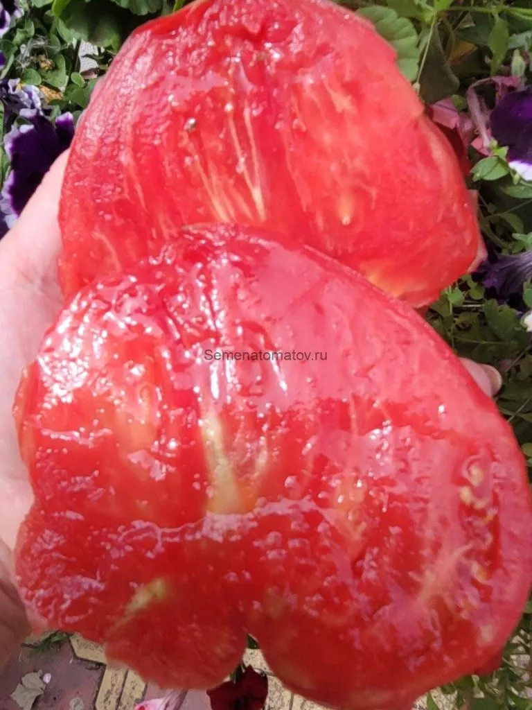 Кожица тонкая, но достаточно плотная, чтобы удерживать мякоть, однако при перегрузке урожаем или неравномерном поливе плоды могут растрескиваться у плодоножки. Это характерная особенность многих крупноплодных томатов с нежной кожицей. Мякоть сахаристая, многокамерная, с небольшим количеством семян, очень сочная.