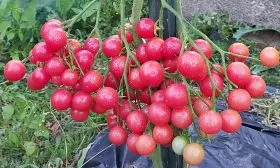 Несмотря на небольшую массу в 30-40 граммов, сорт демонстрирует высокую урожайность за счет количества плодов. Они формируются в длинных, разветвленных кистях, где может одновременно созревать по 15-20 и более штук. Такое обильное плодоношение требует от куста, особенно в теплице, регулярного и полноценного питания.