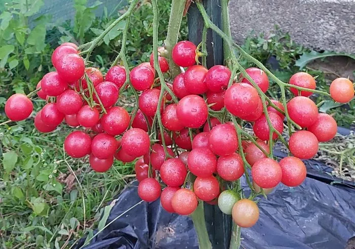 Несмотря на небольшую массу в 30-40 граммов, сорт демонстрирует высокую урожайность за счет количества плодов. Они формируются в длинных, разветвленных кистях, где может одновременно созревать по 15-20 и более штук. Такое обильное плодоношение требует от куста, особенно в теплице, регулярного и полноценного питания.