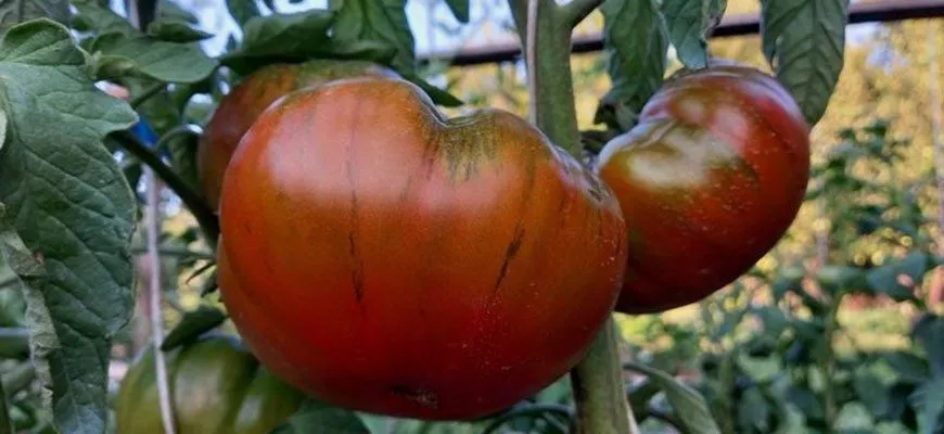 Спелые помидоры окрашены в светло-коричневый или красно-коричневый оттенок, их масса варьируется от 300 до 350 г. У них округлая конфигурация. Мякоть мясистая, сочная, с приятным вкусом.