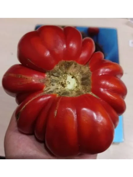 Именно плоды — визитная карточка этого сорта. Они приковывают внимание своими размерами и необычной формой. Плоды плоскокруглые, с сильно выраженными крупными ребрами, особенно у плодоножки, что делает их похожими на старинную пуговицу или гофрированный цветок. В полной зрелости они приобретают насыщенный красный цвет.