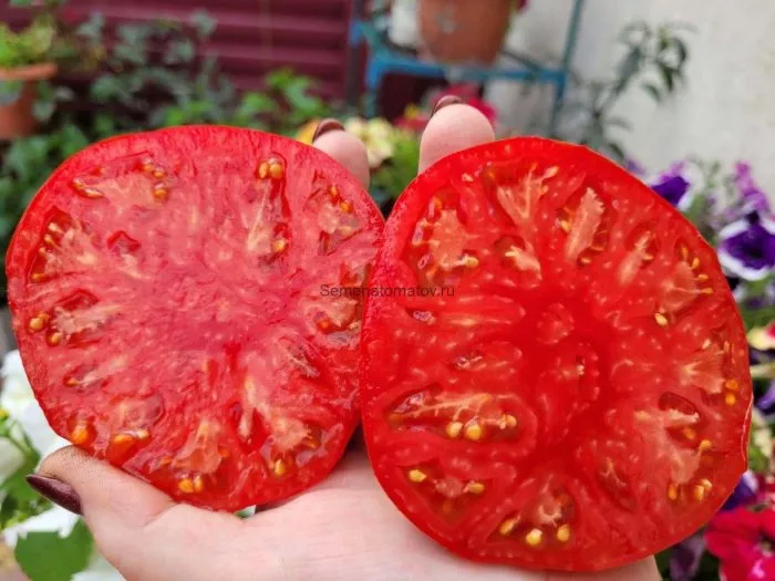 Мякоть отличается исключительной плотностью и мясистостью, количество семян и сока невелико. Такая структура, с выраженными семенными камерами, является классической для биф-томатов. Плотная кожица, несмотря на тонкость, достаточно прочна, чтобы удерживать форму крупного плода, но не грубая.