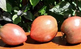 Лонгхорн выделяется даже на фоне других биф-сортов. Его главная визитная карточка — удлиненная сердцевидная форма плода, напоминающая бычий рог, что и отражено в названии. Окраска зрелых томатов сложная: основной цвет фиолетово-розовый, а у плодоножки часто остаются характерные оливково-зеленые «плечи».