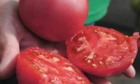 Плоды — визитная карточка этого сорта. Их насыщенный малиновый цвет, который проявляется по мере полного созревания, сложно спутать с другими оттенками. Помидоры округлые, ровные, классической «помидорной» формы, без выраженной ребристости у плодоножки.