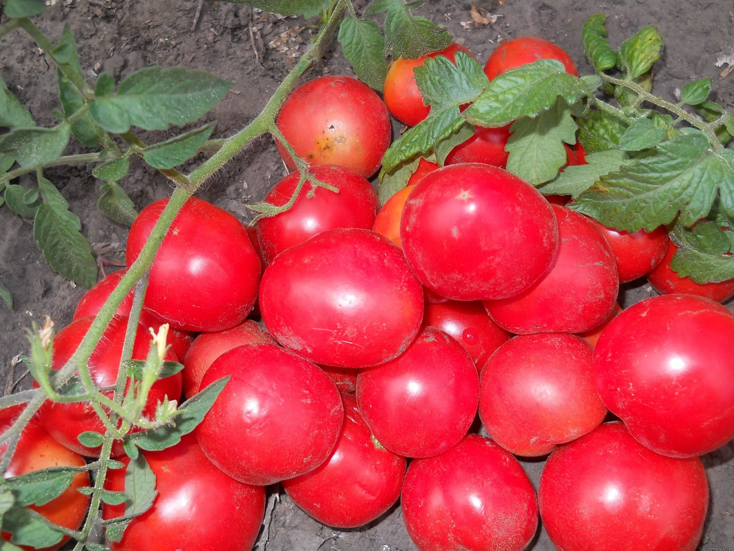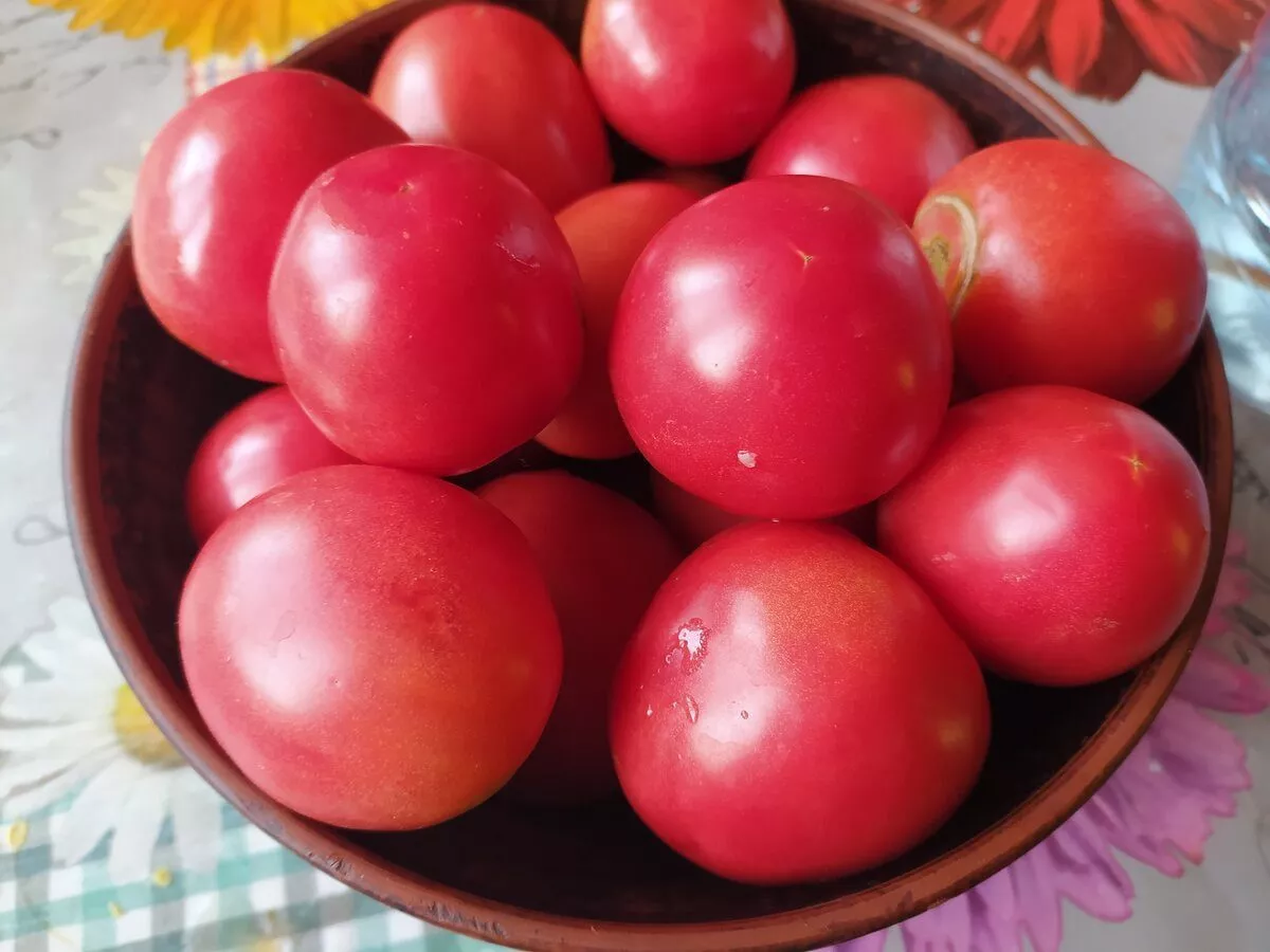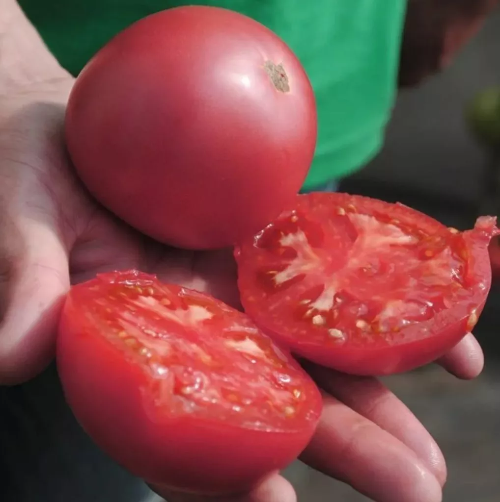 Плоды — визитная карточка этого сорта. Их насыщенный малиновый цвет, который проявляется по мере полного созревания, сложно спутать с другими оттенками. Помидоры округлые, ровные, классической «помидорной» формы, без выраженной ребристости у плодоножки.