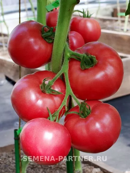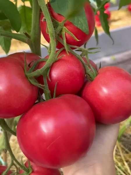 Главная отличительная черта гибрида — его крупные и эффектные плоды. Их классическая сердцевидная форма со слабо выраженной ребристостью у плодоножки делает их узнаваемыми. В период технической спелости окраска светло-зеленая, без темного пятна у основания, а при полном созревании томаты наливаются равномерным, насыщенным розовым, часто описываемым как малиновый, цветом.