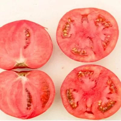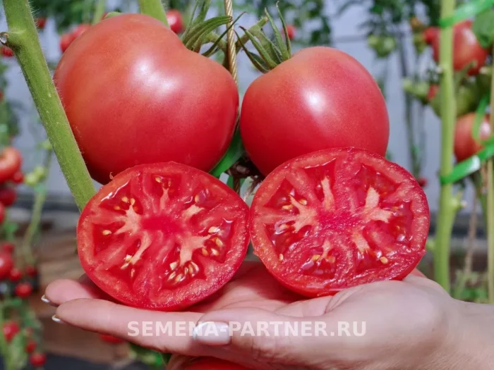 Томаты многокамерные, с большим количеством семян. Мякоть сочная, мясистая, сахаристая на изломе. Тонкая, но при этом плотная кожица обеспечивает хорошую защиту от растрескивания при соблюдении режима полива, что является значимым преимуществом для розовоплодных сортов, часто склонных к этой проблеме.