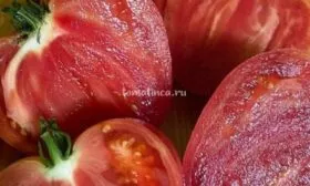 Полностью созревшие томаты приобретают насыщенный розовый, иногда с малиновым оттенком, цвет. Мякоть очень мясистая, многокамерная, с небольшим количеством семян и характерным сахарным изломом. Сочетание тонкой, но плотной кожицы и нежной мякоти создает узнаваемый вкус и текстуру.