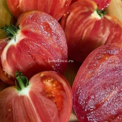 Полностью созревшие томаты приобретают насыщенный розовый, иногда с малиновым оттенком, цвет. Мякоть очень мясистая, многокамерная, с небольшим количеством семян и характерным сахарным изломом. Сочетание тонкой, но плотной кожицы и нежной мякоти создает узнаваемый вкус и текстуру.