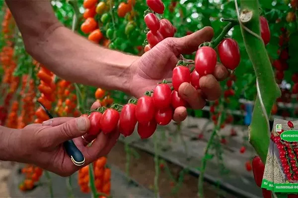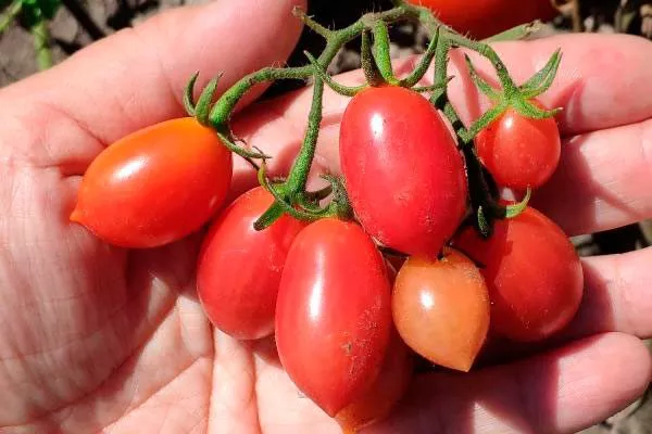 - Томаты небольшие, ярко-красные, напоминают «черри» или «пальчики». Формируются в простых или сложных кистях по 10-30 шт. Масса одного овоща варьируется от 20 до 27 г. Они поспевают постепенно, поэтому сбор урожая проходит неравномерно.
