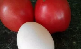 Плоды имеют узнаваемую форму: они округлые, но с выраженным вытянутым «носиком» у основания. Это отличает их от шарообразных томатов. Окрас в биологической спелости — равномерный, насыщенный малиновый, без зеленого пятна у плодоножки.
