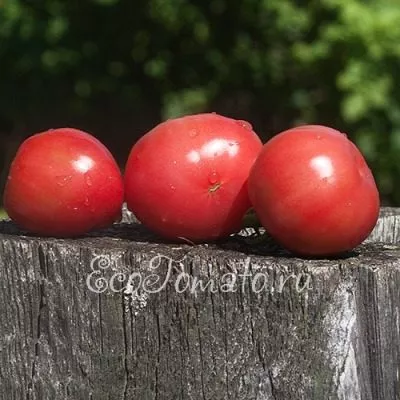 Плоды имеют узнаваемую форму: они округлые, но с выраженным вытянутым «носиком» у основания. Это отличает их от шарообразных томатов. Окрас в биологической спелости — равномерный, насыщенный малиновый, без зеленого пятна у плодоножки.