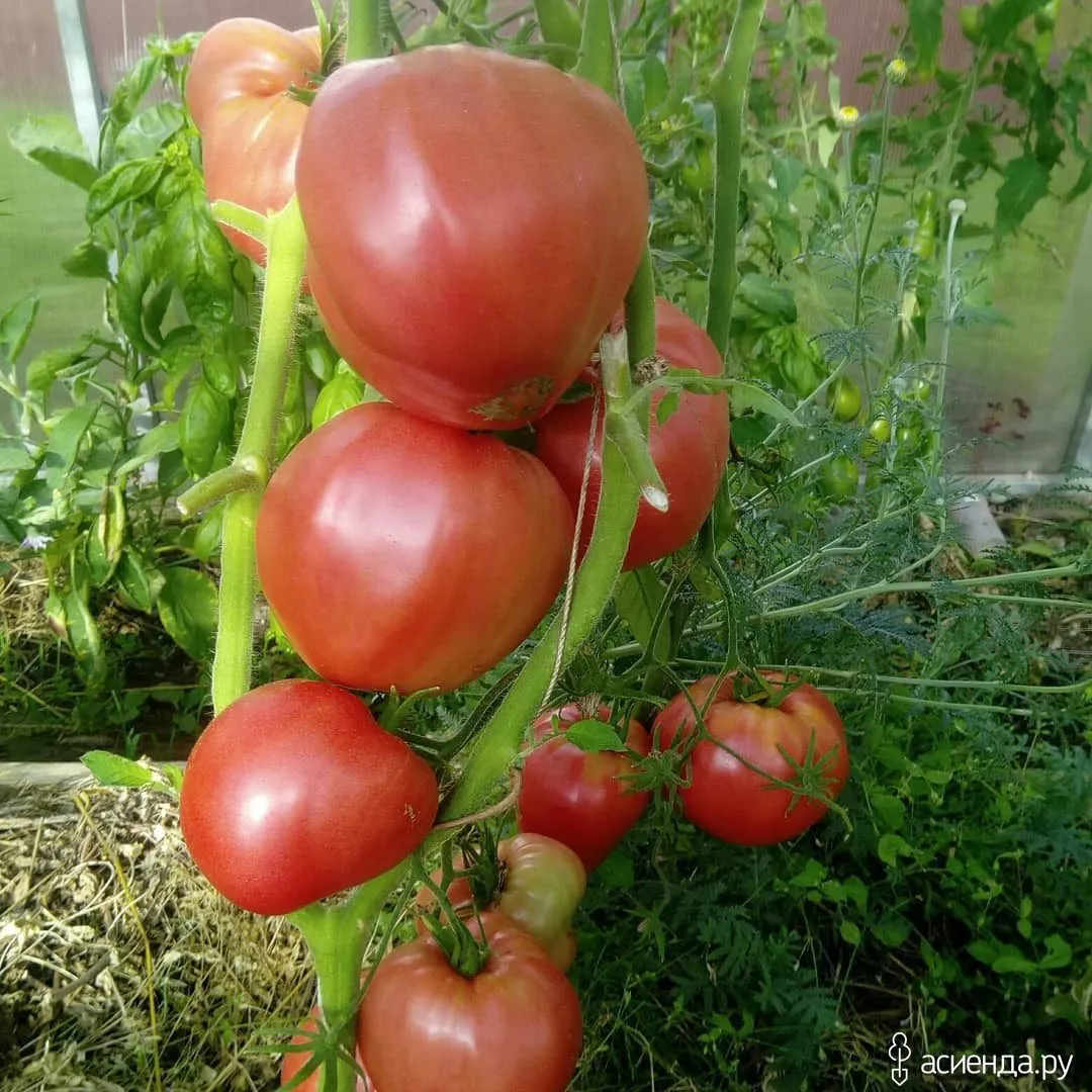 Плоды имеют узнаваемую удлиненно-сердцевидную форму, часто с выраженным «носиком». В стадии технической спелости они светло-зеленые, а при полном созревании приобретают насыщенный розовый цвет, характерный для многих биф-томатов.