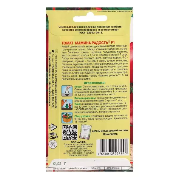 Как и все гибриды F1, Мамина радость обладает эффектом гетерозиса («гибридной силы»). Это проявляется в повышенной жизнестойкости растений, выравненности плодов и высокой урожайности, заявленной в характеристиках. Однако эти уникальные свойства в полном объеме наследуются только первым поколением.