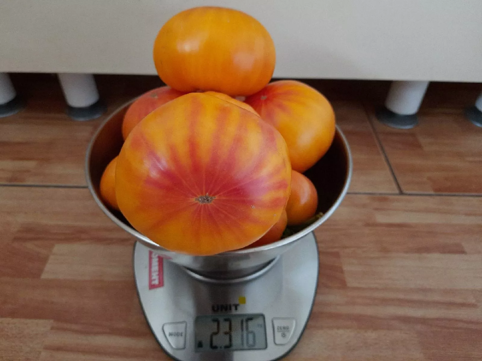 Мякоть соответствует категории биф: плотная, маслянистая, сахаристая на изломе, с минимальным количеством семян и сока. Плоды многокамерные. Средняя масса в 300-600 грамм является стабильным сортовым признаком. Для получения томатов в верхней весовой категории (от 500 грамм) необходимо нормирование кистей, оставляя на них не более 2-3 завязей.