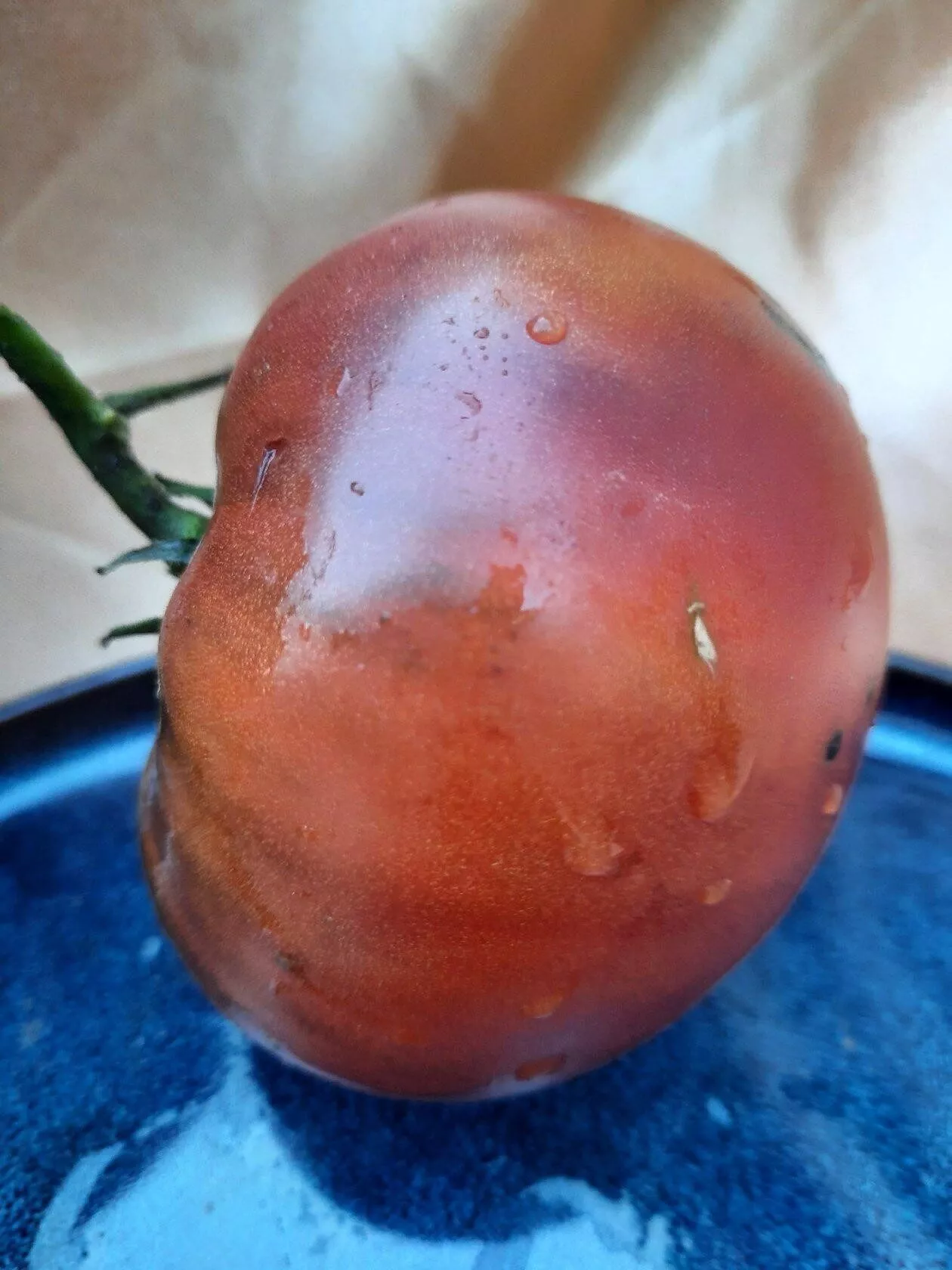 Плоды формируются крупными, что соответствует заявленной массе от 250 до 300 граммов. Их плоскоокруглая форма часто бывает неровной, с хорошо заметной ребристостью, особенно в области плодоножки. Эта ребристость более выражена у самых крупных экземпляров первого сбора.