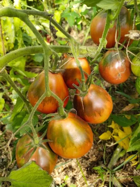 Плоды формируются в простых и промежуточных (с разветвлением) кистях. В каждой такой кисти завязывается от 5 до 7 томатов. Благодаря длинным плодоножкам и живописному свисанию грушевидных гроздей, куст выглядит необычайно нарядно и часто используется в качестве элемента садового дизайна.