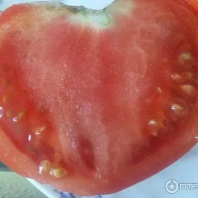 Мякоть у гибрида мясистая и сочная, с хорошо сбалансированным вкусом, где сладость гармонично сочетается с традиционной томатной кислинкой. Внутри плода обычно формируется 3-4 семенные камеры с небольшим количеством семян, что характерно для современных гибридных форм.