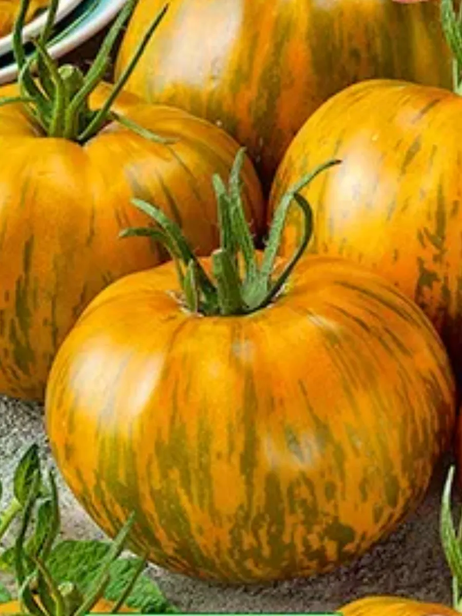 Окрас является сложным и динамичным. В стадии технической спелости томаты имеют светло-зеленую основу с темно-зелеными, почти черными полосами у плодоножки. По мере созревания основной фон последовательно меняется от желтого к насыщенному оранжевому, а полосы становятся ярко-красными или красно-бордовыми. Эта полосатость — не поверхностный румянец, а пигментация, пронизывающая кожицу, поэтому рисунок виден даже на разрезе.