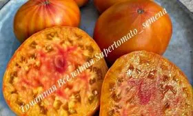Форма плодов плоско-округлая, часто с выраженной ребристостью у плодоножки, что характерно для многих крупноплодных сортов. Плоды многокамерные, но с небольшим количеством семян. Мякоть исключительно мясистая, нежная и сочная, с высоким содержанием сухих веществ.