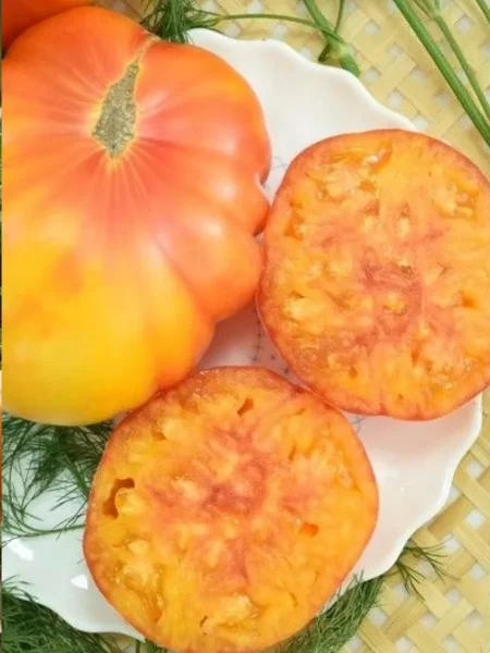Форма плодов плоско-округлая, часто с выраженной ребристостью у плодоножки, что характерно для многих крупноплодных сортов. Плоды многокамерные, но с небольшим количеством семян. Мякоть исключительно мясистая, нежная и сочная, с высоким содержанием сухих веществ.