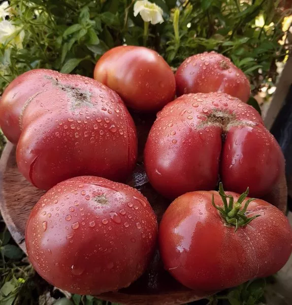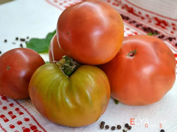 Главная отличительная черта сорта — его плоды. Их плоскоокруглая, часто с заметной ребристостью у плодоножки форма сразу указывает на принадлежность к крупноплодным, «мясным» типам. Масса в 250-400 граммов является стандартной, при этом первые завязи на нижних кистях нередко вырастают более крупными.