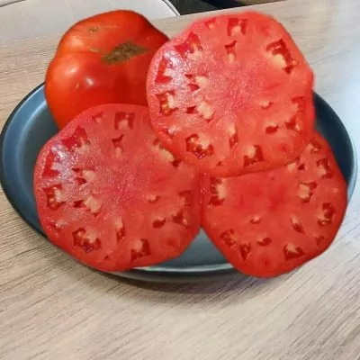 Идеальная мясистость для переработки. В разрезе плод демонстрирует практически сплошную мякоть с минимальными семенными камерами и очень малым количеством свободного сока. Мякоть плотная, сахаристая на изломе, с насыщенным, сбалансированным классическим томатным вкусом.
