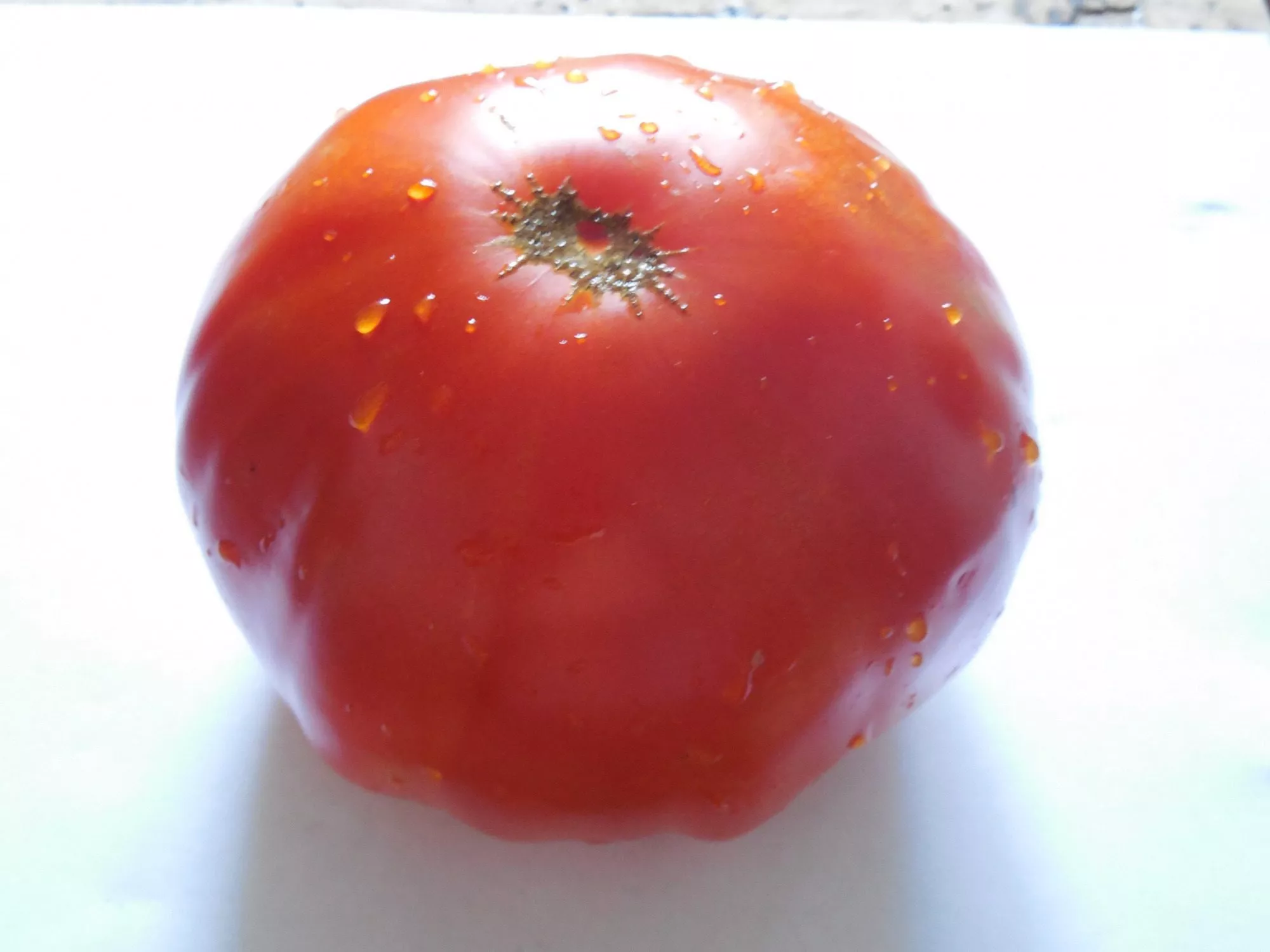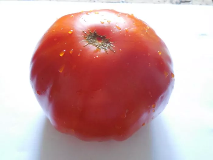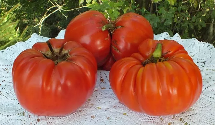 Форма плодов — классическая плоскоокруглая, часто с выраженной ребристостью, особенно в области плодоножки. Эти складочки не являются дефектом, а, наоборот, считаются сортовым признаком, придающим томату характерный «старинный» или «ребристый» вид. Окраска в фазе полной зрелости — насыщенная, равномерная, от малиновой до густо-розовой.