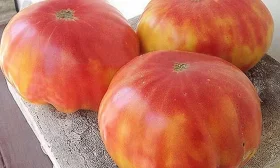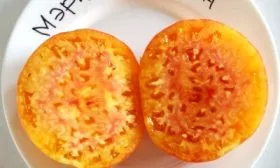 Крупные, плоскоокруглые плоды оранжевого цвета с розовыми прожилками выглядят эффектно в нарезке. Они идеально подходят для свежих салатов, где выполняют двойную роль: служат вкусовой основой благодаря сладости и создают яркий цветовой акцент. Из-за малого количества семян и плотной мякоти томаты не дают излишней водянистости в блюде.