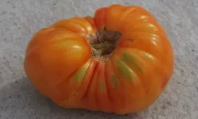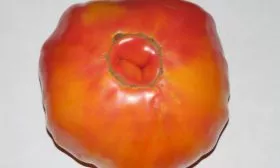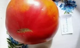 Форма плоскоокруглая, часто с выраженной ребристостью в области плодоножки, особенно у самых крупных экземпляров. Средняя масса плода составляет 300-500 граммов, однако на первых кистях, особенно при нормировании завязей, томаты могут наливаться и больше.