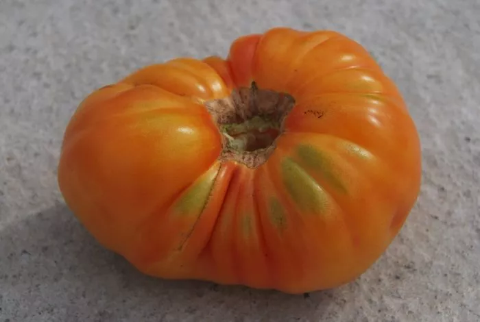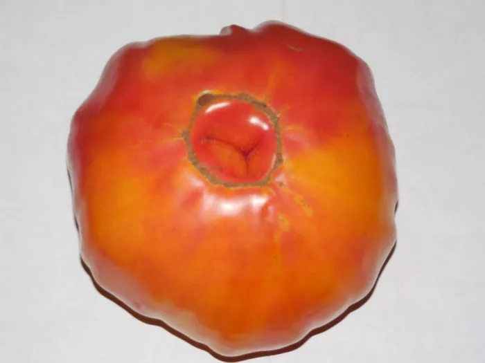 Форма плоскоокруглая, часто с выраженной ребристостью в области плодоножки, особенно у самых крупных экземпляров. Средняя масса плода составляет 300-500 граммов, однако на первых кистях, особенно при нормировании завязей, томаты могут наливаться и больше.