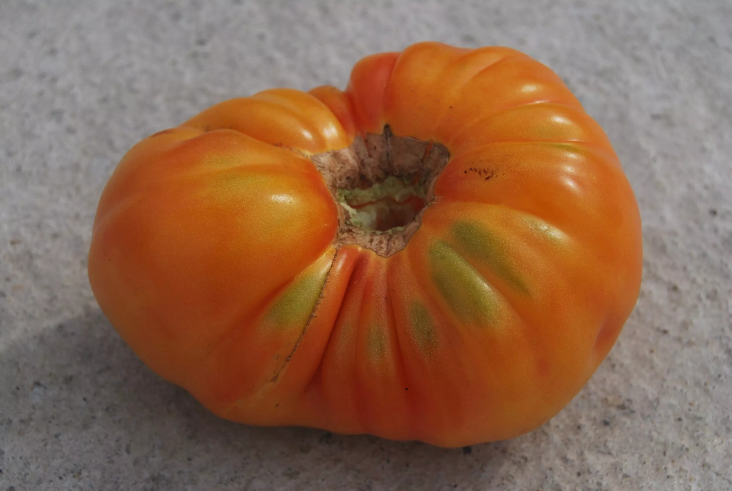 Главная отличительная черта этого сорта — уникальная окраска плодов. В фазе технической спелости они имеют зеленый цвет с характерным темно-зеленым пятном у основания. По мере созревания основной фон становится насыщенным оранжевым, но не однородным: на поверхности проявляется сетчатый рисунок из розовых прожилок и размытый румянец, создавая эффект мрамора или перламутра.