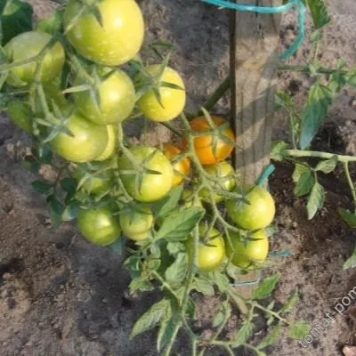 Томаты собраны в простые кисти, по 6-10 штук в каждой. Такое обильное плодоношение на одной кисти создает эффектную картину усыпанного яркими «шариками» куста. Плоды в кисти созревают достаточно дружно, что удобно для сбора.