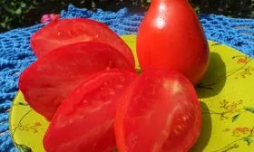 Особенности плода напрямую вытекают из его универсального назначения. Ярко-красный цвет зрелого томата свидетельствует о высоком содержании ликопина. Вытянутая форма с носиком и масса 100-130 граммов делают плоды очень удобными для механической обработки и цельноплодного консервирования.