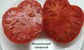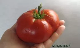 Плоды этого минусинского сорта обладают ярко выраженными сортовыми признаками, которые делают их узнаваемыми. Их главная визуальная черта — внушительные размеры и характерная приплюснутая, часто многокамерная форма, соответствующая заявленной плоскоокруглой. Ребристость у плодоножки выражена сильно, что придает томату старинный, «настоящий» вид.